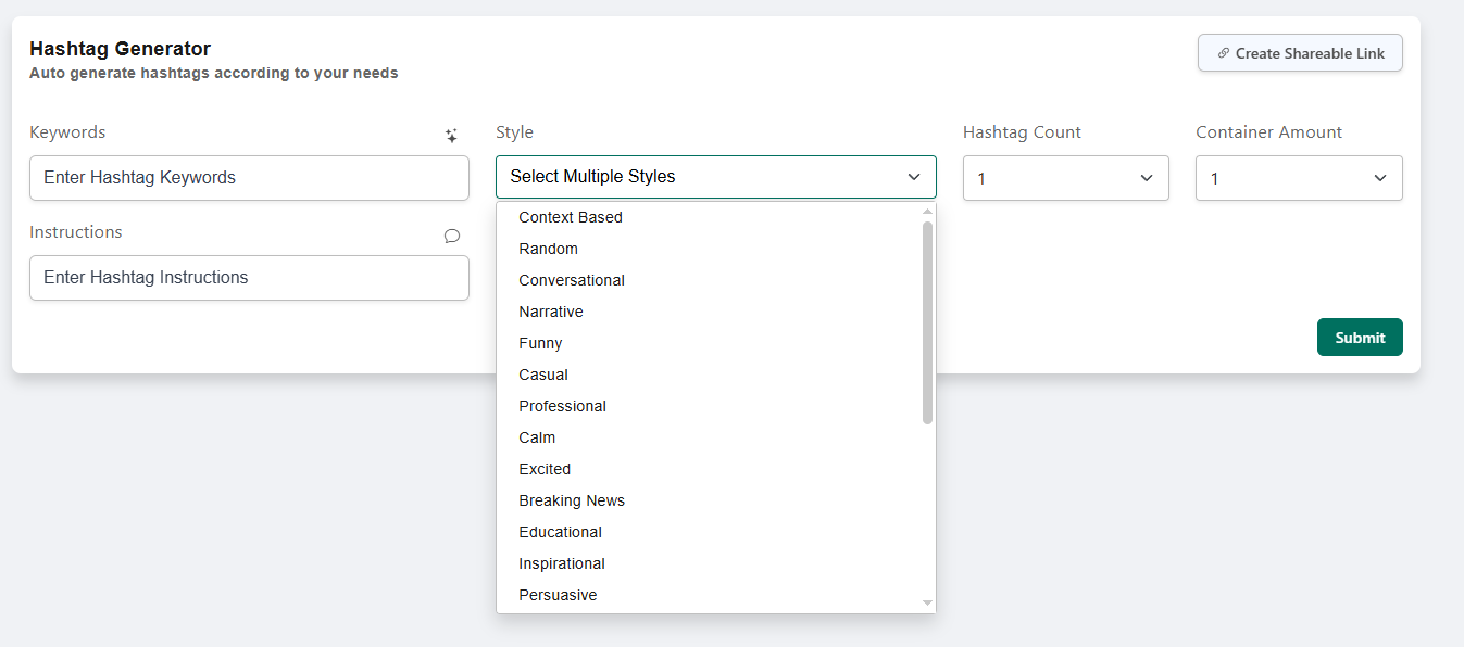EZHashtags generates hashtag ideas based on your keywords, optional instructions, and selected styles such as professional, funny, educational, conversational, inspirational, and more. This allows you to guide both the topic and tone of your hashtags so they align with the content you’re publishing and the audience you’re trying to reach.